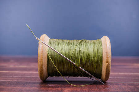 Vintage grunge wooden green thread spool with needle on wooden board background