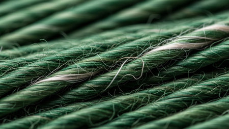 Thick showing extreme close-up macro shot of a thick vibrant green braided rope made of natural fibers showcasing intricate texture and detail keywords: green rope,...