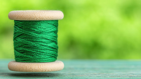 A close-up image of a green thread spool resting on a wooden surface, set against a softly blurred green background, perfect for crafting themes.