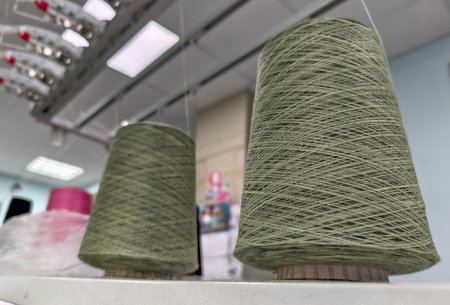 bobbins of wool yarn on a knitting machine in the knitting process.