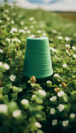 Green spool of thread and white flowers in the meadow.
