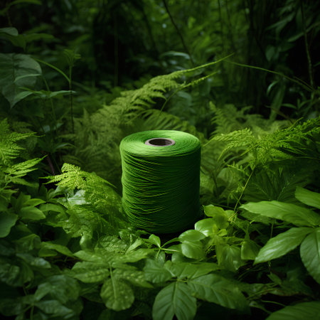 Spool of green thread on a background of green ferns
