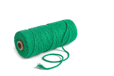Green Color Skein single strand Cotton cord rope for macrame on white. Use for DIY handcraft. Closeup Textile bobbin reel