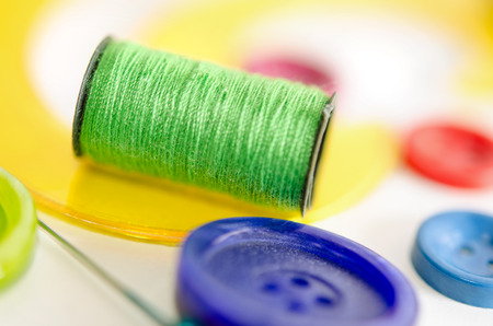 Sewing kit on the white background. Macro shot. Colorful set consisting of buttons, pins, soap and bobbins.