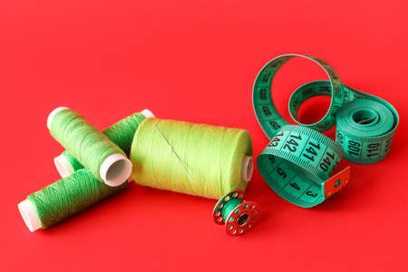 Sewing thread spools with needle and measuring tape on color background