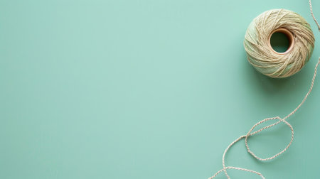 Roll of string lies on plain teal background with loose end unraveled