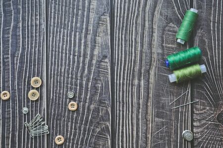 Sewing accessories on dark wooden background. Green sewing threads, needles, buttons and pins. top view, flatlay
