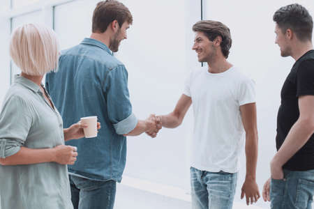 Two businessmen are making a deal, they are shaking their hands. Multiracial coworking, friendly atmosphere