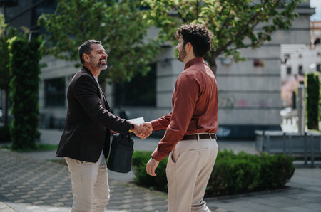 Two men greeting each other with a handshake outdoors in a city environment