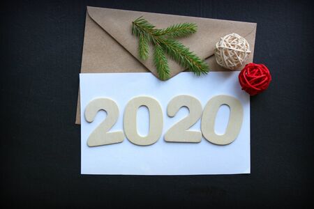 2020 New year, Christmas background. Figures in a blank letter, copy space. Christmas composition, greeting card. Spruce branch, red and white ball.