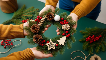 Christmas wreath Gift Christmas idea. Do it yourself instruction postcard eco-friendly decoration. Making handmade presents childrens diy projects. Holiday family time