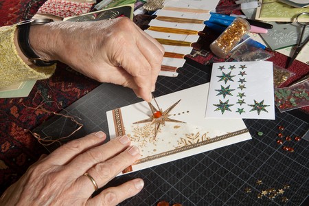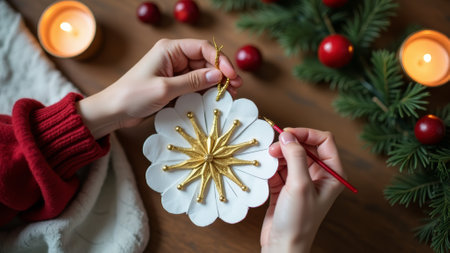 Crafting festive decorations: hands adding glitter to wooden snowflake amidst holiday ornaments.