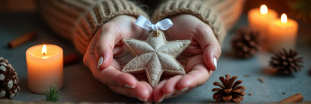 Cozy winter warmth with candlelight and rustic star ornament in hands.