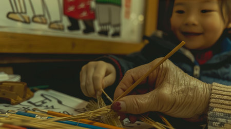 Grandparents teach traditional crafts to their grandchildren, focusing on hands at work, knowledge exchange, and intergenerational family connections.