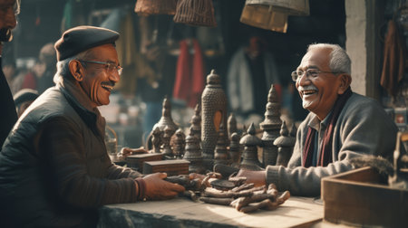 A bustling market scene showcasing an artisan creating jewelry on a loom. Surrounding the artisan are various handmade crafts, including pottery, woven baskets, and intricate jewelry.