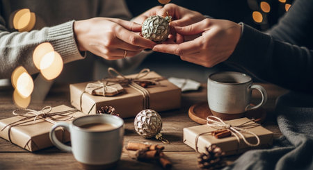 Two people exchanging a decorative ornament over a table with wrapped gifts and mugs, creating a cozy holiday atmosphere