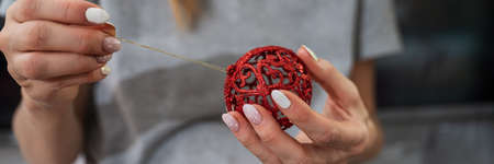 Closeup view of female hand attaching golden string to a shiny red christmas holiday bauble.