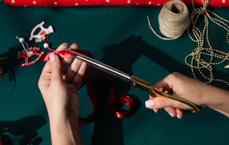 Female hands cutting shiny red ribbon with golden scissors on green surface surrounded by holiday decorations, twine, and ornaments in bright sunlight.
