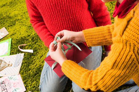 cropped shot of little kids tying up bow on handmade greeting envelope