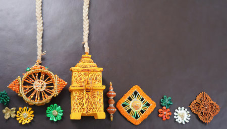 Indian traditional handmade puppet dolls made of jute isolated on blurred background is displayed in a street shop for sale. Indian handicraft and art