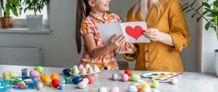 Mother and daughter together at home celebration concept sitting reading greeting card