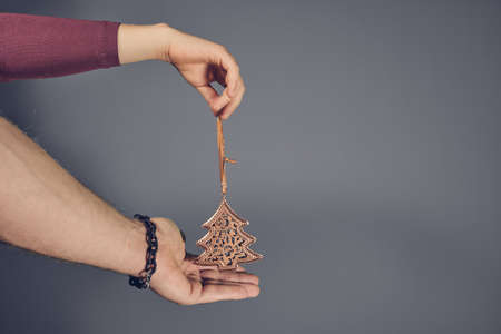 Close up of female hands making christmas decoration in rustic wooden workshop.
