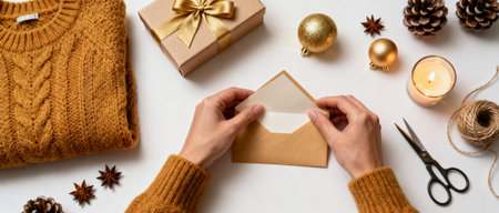 Person tying string on a rustic envelope surrounded by cozy sweater, candles, pinecones, gift wrap, and festive holiday decorations.