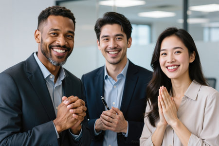 Three professionals, two men and one woman, smiling and clapping in an office setting, likely celebrating a success or achievement.
