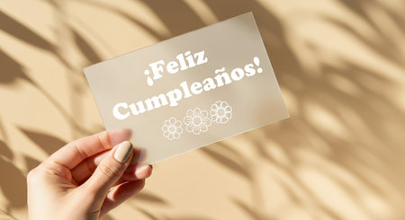 A beautifully designed birthday card featuring the phrase Feliz Cumpleanos meaning Happy Birthday in Spanish. The card is surrounded by delicate floral illustrations. The soft shadows create a warm and inviting atmosphere, perfect for celebrating a special day