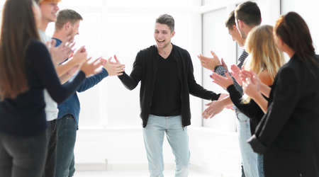 The leader of the company, surrounded by employees applauding him, rejoices at the success