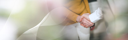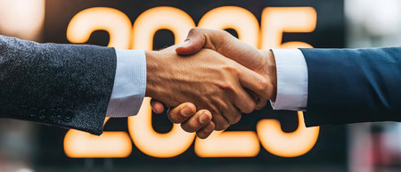 close up of business handshake symbolizes partnership and collaboration, set against backdrop featuring year 2025, reflecting future aspirations and goals.