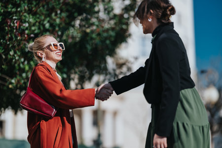 Two women shake hands in an outdoor urban setting, smiling and meeting with style
