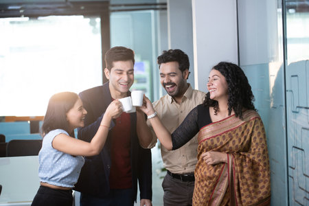 Indian business people having a coffee break in creative office. Multiethnic corporate business team concept.