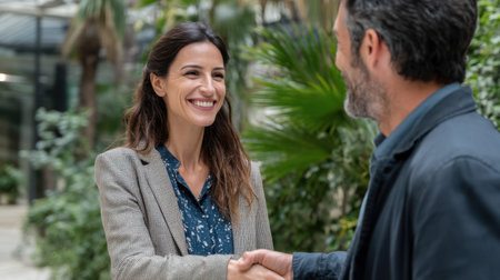 Two professionals engage in a friendly handshake within a stylish indoor garden, showcasing a moment of collaboration and positivity.