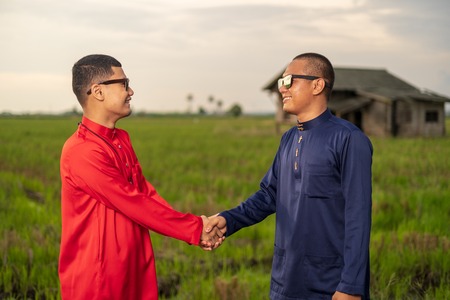 muslim friends and families visiting home and greet embrace each other celebrating eid mubarak handshaking ask for forgiveness as Asian Muslim culture during with paddy background. Selective focus.