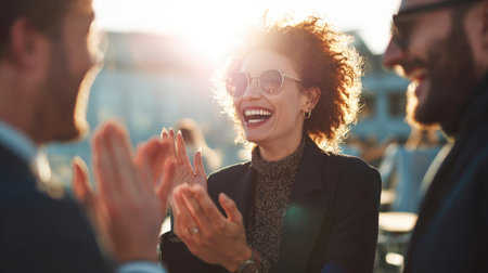 Close-up, backlit portrait of a joyful woman in sunglasses and business attire, laughing and enthusiastically clapping her hands while celebrating outdoors with colleagues, capturing success, teamwork, and positive energy at sunset.