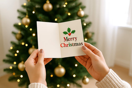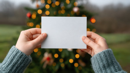 Hands holding christmas greeting card with festive tree in background. concept of holiday celebration, merry christmas wishes, seasonal greetings.