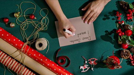 Top view of female hands writing a Christmas letter that begins Dear Santa, I want on a piece of paper surrounded by holiday decorations. Cozy Christmas mood and creative flat lay for holiday content.