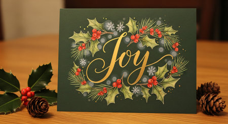 Elegant Christmas card with 'Joy' in gold script, framed by a festive wreath of holly, berries, and pine needles, accompanied by natural holly and pinecones on a wooden surface.