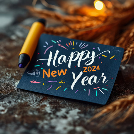 Greeting card with gold fireworks design for New Year, resting on an envelope next to flowers