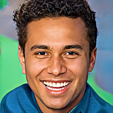 A young man stands in front of a muted wall, wearing a relaxed t-shirt. His confident gaze and gentle smile convey a sense of ease and approachability, illuminated by natural light.