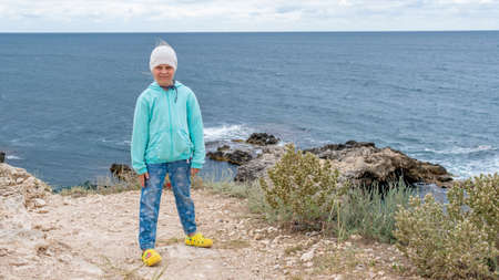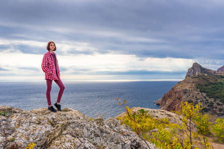 Teen tourist girl standing on mountain cliff against beautiful seascape in cloudy day. Young lady posing on background of sea, mountains and sky. Traveling and discovering distant places of Earth.