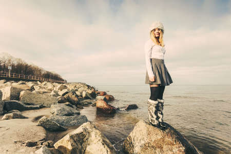 Beautiful, idyllic seaside landscape concept. Rocks stones, water sea horizon on cloudy day, woman watching beautiful landscapes.