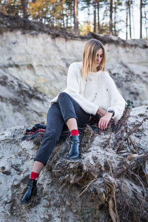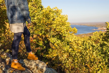 Young woman, girl, teenager on the top of the mountain. Around nature, autumn landscape. One can see the legs in jeans, boots and jacket. Modern youth clothing.