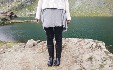Female legs in jeans and hiking boots near edge of mountain lake. Rocks reflection on water surface