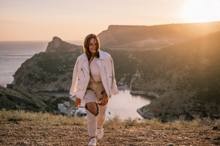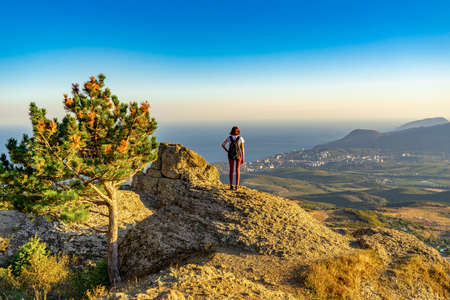 Rear view of young woman standing on mountain cliff and admiring beautiful landscape of coastal town in mountainous area. Teen tourist girl walking in mountains in summer evening. Travel destinations.