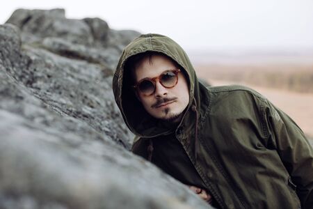modern young man on the background of sandy hills in full growth, in loose clothing, looking at the camera, wearing round dark glasses