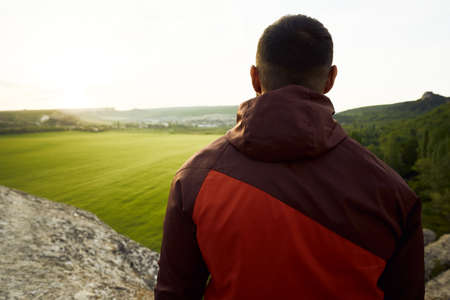 Bulgaria - 05 22 2024: Man with vibrant orange jacket and jeans standing on the edge of a rock looking at the bright light over the trees with a lot of fog.