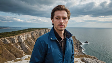 A young man adventurer with contrast yellow jacket posing over cliff by sea under gloomy sky with dramatic clouds