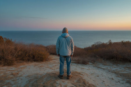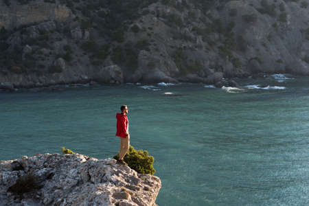 attractive man standing watching the sunset from a cliff by the sea, concept of leisure and relax, copy space for text